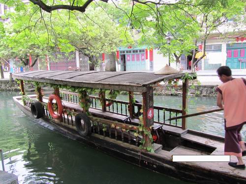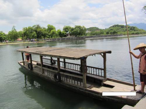 これが漓江につながる南渠下りを遊覧する観光船であり、船頭さんが漕いでくれますから、約20分かかります。