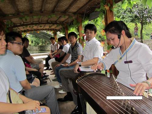 南渠の遊覧船の中で霊渠公園のガイドさんが上手に中國の伝統的楽器の古筝を演奏してくれました。彼女の曲を聴くと秦の始皇帝の時代にタイムスリップしたような気がしました。