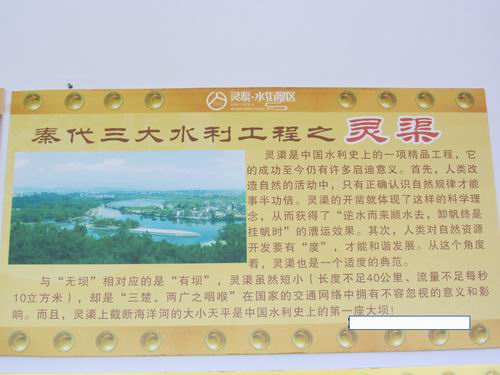 公園に入り、左側にある模型室の壁に「秦の時代の三大水利施設の一つである霊渠」についての説明文があります。(ほかの二大水利施設として四川省の都江堰と陝西省の鄭国渠がありました)