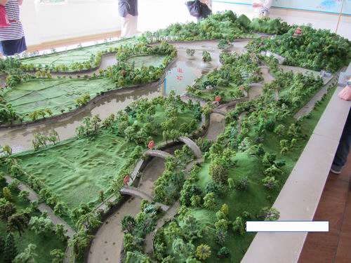これが霊渠の模型で、右側(手前)のほうが南の漓江につながる南渠です。橋が多く架かっています。真ん中のほうが古い湘江の川底で、一番左のほうが北渠で湘江につながっています。