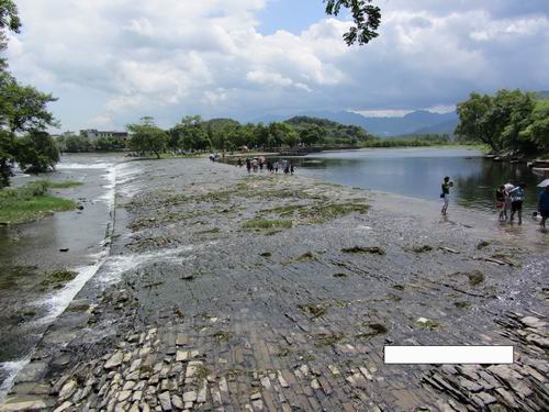 ここは霊渠の小天秤と呼ばれ、長さ130mあり、三割の海洋河の水を堰き止めて南の漓江に流れるようにするための施設です。一見すれば何の変哲もないようですが、実地調査によれば、下敷きとしてまず水に強い松の木の材木が使われ、その上に頑丈な石でぎっしり敷き詰めてあります。そして石と石の間に溶かした銑鉄で結ばれているということです。2200年の前にしては立派な技術だと言えます。この技術に引かれた観光客が裸足で古い小天秤を踏み、体感していました。