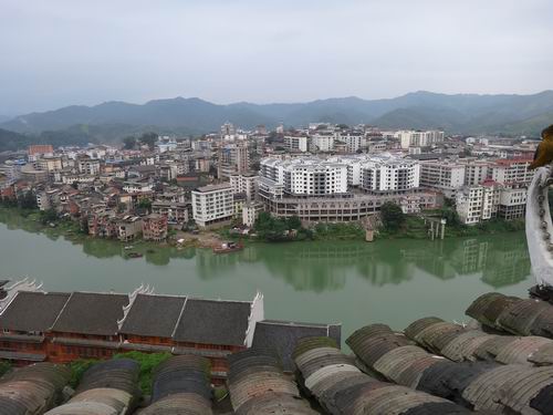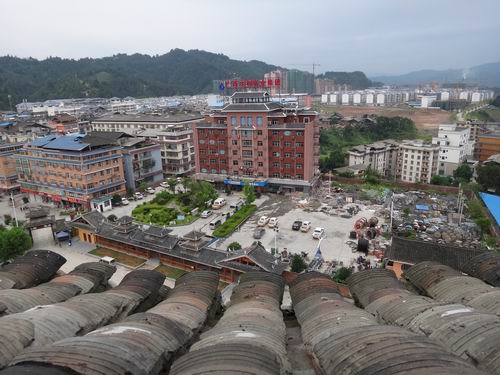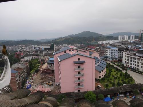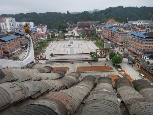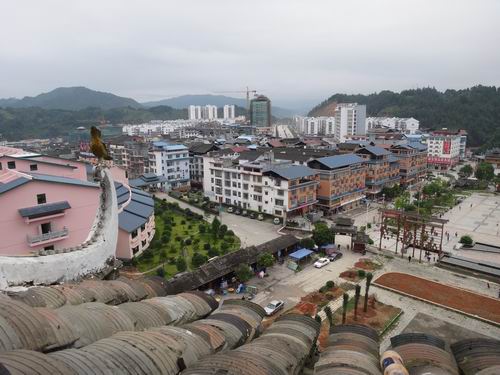 鼓楼の一番上に登ると周りの景色が一望に納めることができます。遠くに見えるのが三江県の民族広場であり、ここが新市街地を目指して町づくりを進めています。