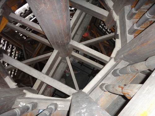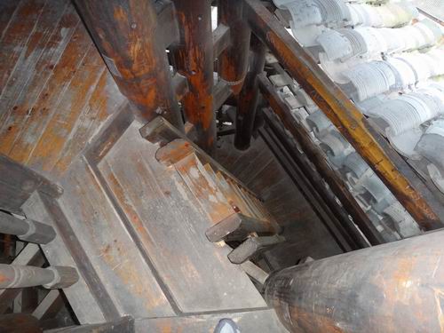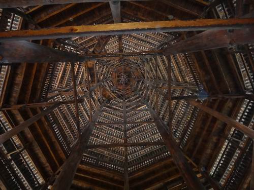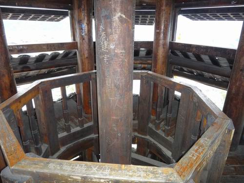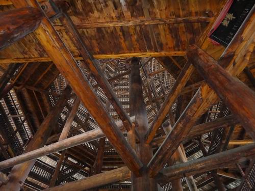 鼓楼の中に入って見ると、なんとすべて木材で組み合わせた構造だと分かりました。鼓楼の隙間から光が差し込んでいるから、そう暗くはないです。