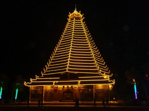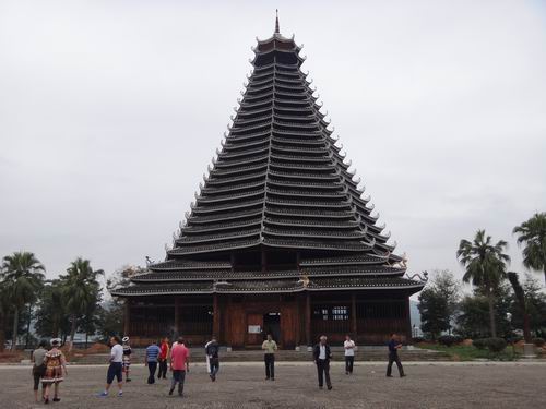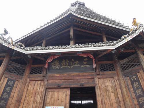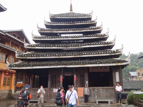 「風雨橋国際大酒店」の側の三江鼓楼は三江県のシンボルのようになり、その前にも三江県の民族広場が広がっています。鼓楼は高さ42、60mでおそらく中國トン族居住地において一番の高さを誇っています。あわせて56本の大黒柱に支えられた鼓楼は精密に27階の構造に造られています。そしてほとんど釘を使わず、すべてホゾとホゾ穴で組み合わせています。見れば開いた口が塞がらないほどのトン族の独特の技術ではないでしょうか?私たちはみんな悔いが残らないように下から150の階段を登り、一番上の27階まで挑戦しました。上に行くほど階段がきつくなったのですが、意外に安定感があり、さすがにトン族の建造物の上手な技術に息を飲みました。胸が少しどきどきしたあと、一番上の27階に辿りついてみると三江県の佇まいが一望ができて満足感を覚えました。