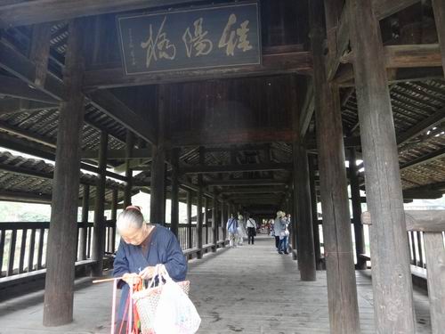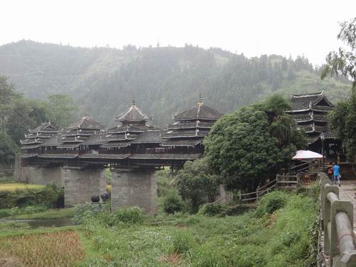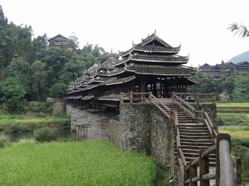 目の前に現れたトン族の自慢作に思われた程陽橋は1916年に造られ、長さ76M、広さ3、4M、高さ10、6Mであります。中國の重要文化財と、トン族居住地域において一番有名な木造の橋と指定されています。今まで中國だけでなく諸外国から建築関係者も憧れて訪れたことがよくありました。橋全体が五つの石作りの橋杭の上に二層に組み合わせた材木を架けておきます。その上に、それぞれ五階の屋根の楼閣を造ることにしました。橋の両側に入母屋造りの屋根スタイルの楼閣が造られ、真ん中のが八角の寄棟造りの楼閣で、更にその両側に四角の寄棟造りの楼閣が配置されています。大自然の風雨に染められた材木の黒ずんだ色と周りの緑色とがコントラストよくできています。どちらから見ても、とても洒落ていて落ち着いています。これらの楼閣の間に屋根付きの廊下がつながり、普段、上を歩くと雨に濡れる心配もないし、吹き抜けなので風通しもよいから、「風雨橋」と名付けられたのです。通路の両側にも座れる長いベンチのような施設があるため、村人の休憩や議事などの場所としても機能されています。実用的にも美観的にも見事にマッチしたこの巧みな橋の構造に多くの観光客の心を捉まえて離さないのです。不思議な事にやはり釘を一本も使わないことなのです。
