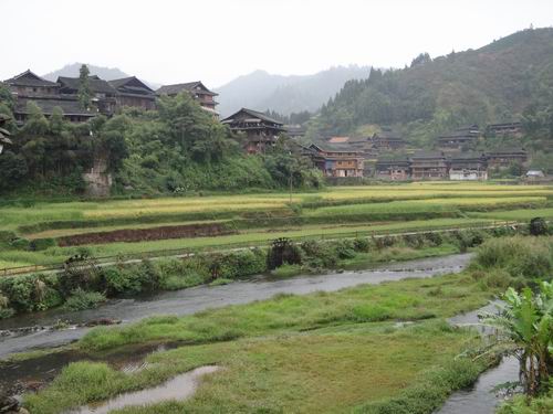 翌日、朝8時半ごろ、ホテルを出発し、19キロ離れた程陽風雨橋に向かいました。例年の秋ならば全然、雨が降るはずもない霧雨の中、バスが45分ぐらい走行しました。両側では、昔のままの水車も動いていたのも見えましたし、黄金色に変わりつつある稲作も、山の斜面にできたお茶畑も、車窓でもきれいに見ることも出来ました。