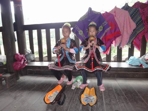 今日は学校のお休みでしょうか。風雨橋の上で二人のトン族の子供が丁寧に瓢箪笛を吹きながら観光客からの「お小遣い」を稼いでいます。