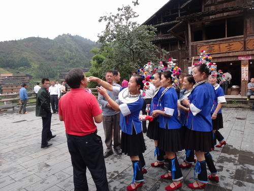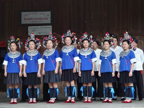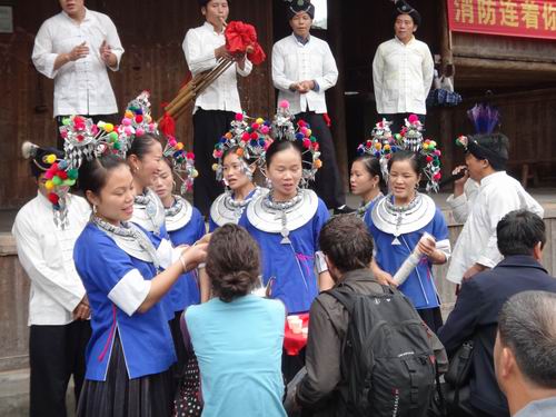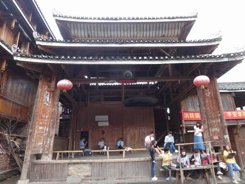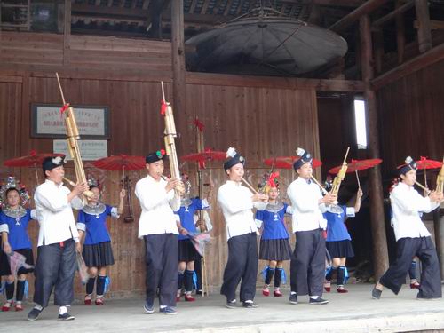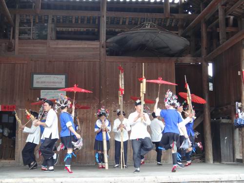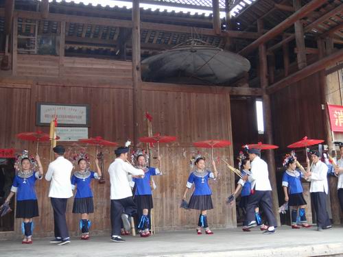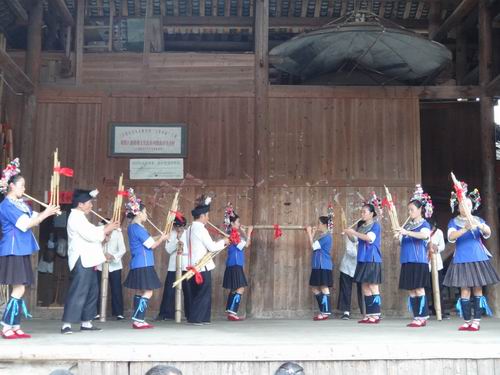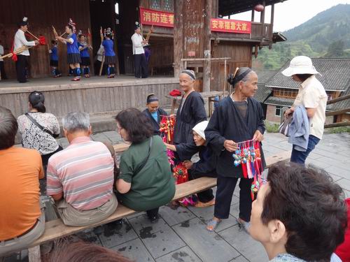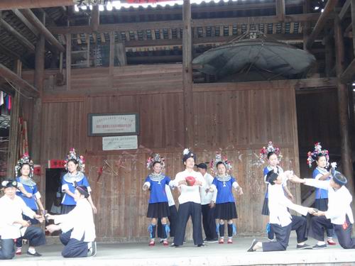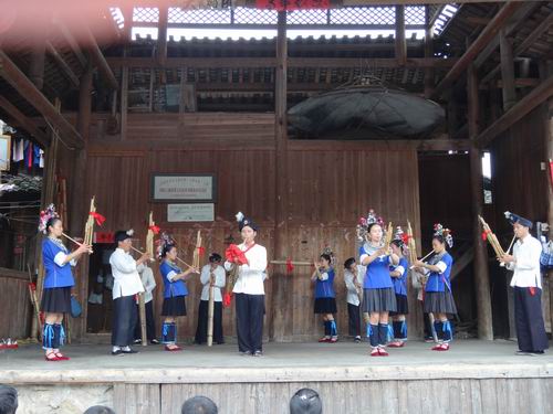 私たちが風雨橋に未練が残った中、いよいよ朝10時半から、程陽村のトン族の村人が公演する素朴なショーを見る時間になりそうです。程陽村のもう一つのシンボルである馬安鼓楼の前の広場で30分間にわたるトン族の民族ショーが公開されるということでした。一見すれば結構古い馬安鼓楼が広場のに北に位置し、周りにトン族の高床式の木造建築の家に囲まれています。ここに来ると、いかにもトン族らしい村の雰囲気に包まれ、興味がそそられます。広場の東に村のステージが設けられ、村への観光の誘致の一環として観光客に公開するショーを定期的に行われています。このショーで、ユニークなトン族大歌(地声のコーラス団)を楽しむことができます。このトン族大歌がトン族の無形文化遺産のように認められています。観光客として絶対見逃してはいけないとお勧めします。また、トン族の蘆笙の笛を吹きながら踊るダンス、蘆笙のメロディに合わせて展開するお酒の勧め踊りなどが観光客に親しまれています。時間があれば一軒のトン族の農家訪問を手配しても差し支えがありません。
