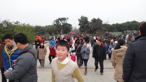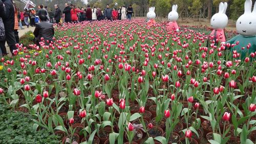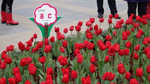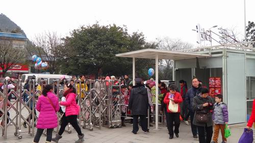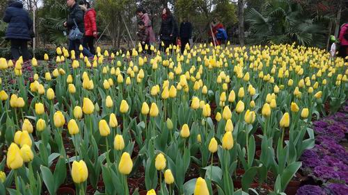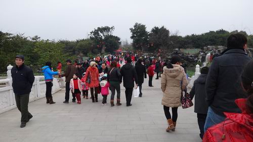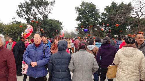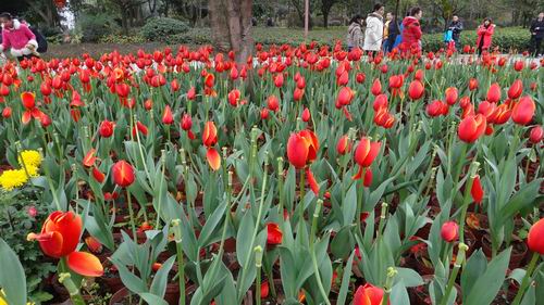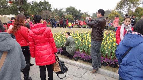 筆者は昼12時ごろ、訾洲公園に行きました。案の定、公園の入り口で入場者で賑わっており、殆ど家族連れの市民たちが列に並び、入場しました。この日は折よく空が曇っていてお天気なので、(実際、桂林は冬の間、雨が降らなければ『お天気』と思われるぐらいです)市民たちがお正月祝いの気分の中で、せっかくのチューリップ大会を楽しむ気持ちが十分理解できるものです。園内に入って見ると、きれいなチューリップ会場で市民たちがめいめいに彩りのチューリップをバッグに写真を撮ったり、鑑賞したりしました。また可憐なチューリップの花に顔を近づけて素直に嗅いでいる子どもの姿も見られました。市民たちが花の鑑賞のついでに広さ約24.5ヘクタールにも及ぶ訾洲公園を散策していました。みんな訾洲公園ゆかりの歴史の人物を偲びながら旧正月の気分をたっぷり堪能することが出来ました。