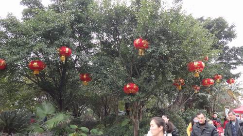 公園の大木にお正月お祝いにたくさんの提灯が飾られています。いかにも中国らしい飾り付けですね。