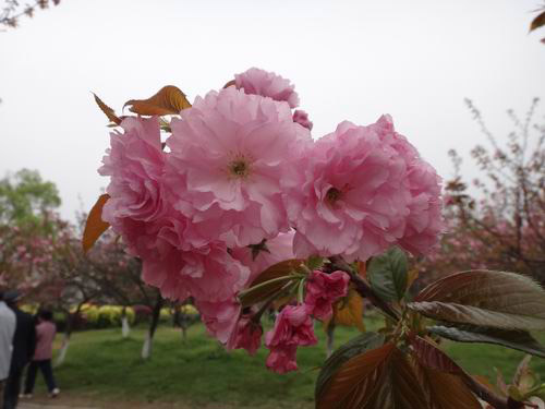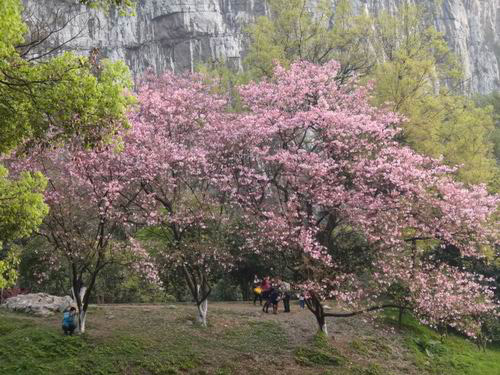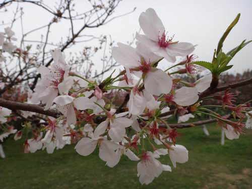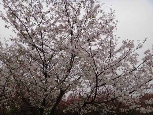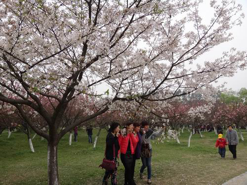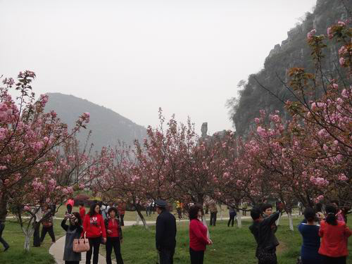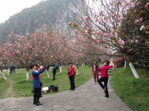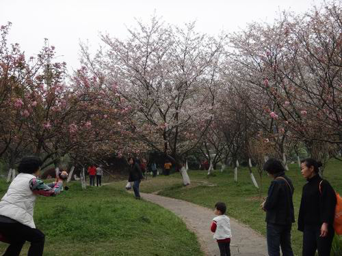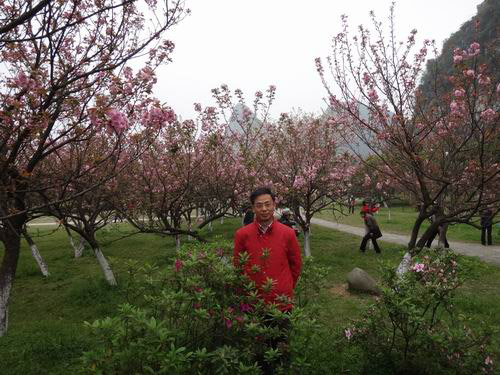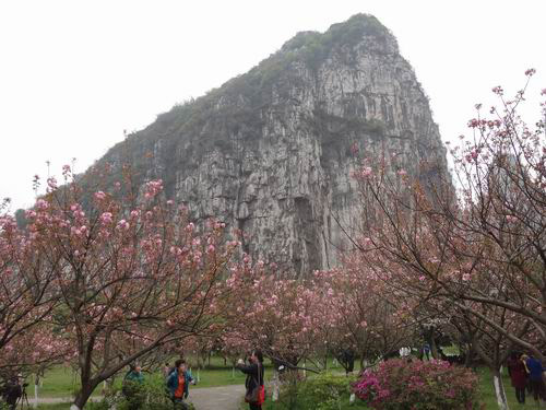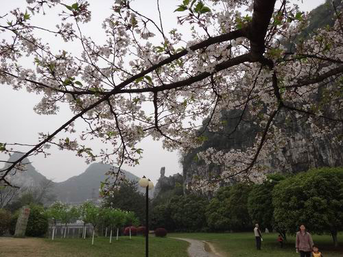 その日は空が曇っていましたが、花見に訪れた市民や観光客が思ったより多かったです。完全には咲いていないですが、結構見頃になっていました。公園は殆ど染井吉野のピンク色に染められ、とても上品な色合いでした。また微かな清い香りもして気持ちが最高でした。園内に溢れた人々が皆、和やかな雰囲気の中に包まれており、満足そうな表情で清い香りに陶酔し、可憐な花弁に見惚れてしまいました。思う存分に鑑賞したり、写真を撮ったりして桂林の春の風物詩を満喫することができました。この花見は既に桂林の市民の春の一大行事のようになっています。南渓山公園の「桜園」はこの行事の代表的な場所となり、例年の「桜花節」などのイベントが開催されるまでに発展しています。