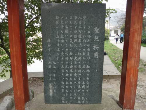 この「聖照桜園」は敷地面積が30ムー(1ムーは666平方メートルになる)に及び、1993年に桂林の名誉市民の称号と授けられた日本の聖道教団の祖師である岩崎照皇先生が70万元を出資して造った桜の花見のための公園だと伝えています。園内は約300本の桜の木が植えられ、染井吉野と言われる割に開花の遅い品種が最も多いとのことです。この品種は日本の独特な改良により原産種のようなものに定着して、既に日本の民間友好の使者のように中日国交が樹立した際、北京などの町に移植されたことがありました。桂林では、南渓山だけではなく西山公園や伏波山公園などにも植えられています。これらの桜も中日友好のシンボルと位置づけられ、毎年春の3月から4月までの間、もし桜の満開のニュースや知らせがあれば必ず市民たちや観光客らが詰めかけてきます。