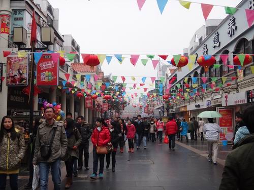 桂林の中心街にある正陽路はお正月の気分に飾られ、買物や散策の観光客に溢れています。ここが桂林の歩行者の天国と言われ、観光客に大人気です。