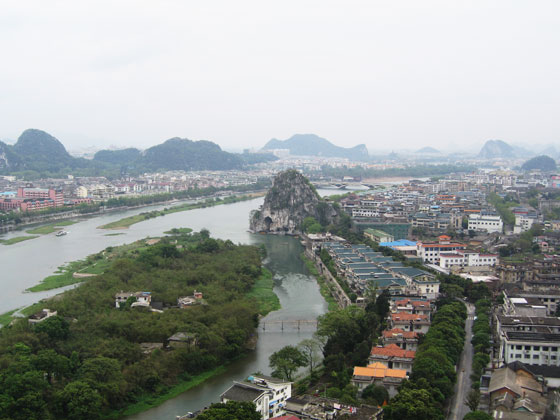 入場門を抜け、階段状の登山道を一歩一歩登っていきますと、頂上の明月峰までは30分ほどで到着できます。そこから桂林市街が一望でき、さらに奇峰の連なった桂林山水画の世界を身近に見ることができます。天気のよい日には遠くの山並みまでクッキリと見通すことができます。また雨の日には、風景が遠く霞んで見える景色にも趣がでます。