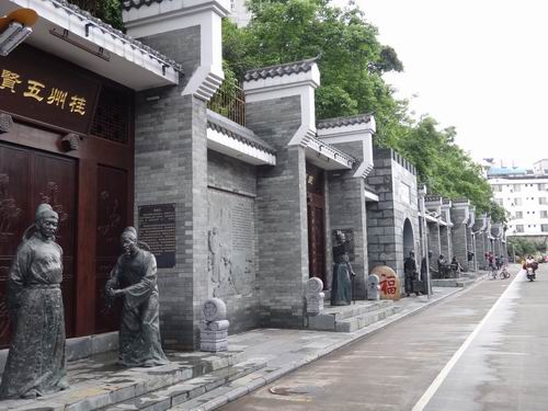 長さ210Mあり、幅11Mの街に登場した人物がすべて唐代から清朝にかけての役人の等身大のブロンズ像であり、そして、210Mも長い古風の石造りの壁なのです。頑丈な青石に人物や風景などを浮き彫りにして見事に立体感を作り出しています。そして古風の煉瓦をふんだんに使っているから、なおさらそのイメージが強まっています。ブロンズ像であろうと、古風の壁のレリーフであろうと、いずれも細工がよく施されており、かなりの出来栄えだと思います。これらの「役人」は記載によると桂林生まれの人もいれば他所から転職してくれた人もいました。彼らは歴史上、自分の一生を人民に奉仕したと伝えられ、芳名を千載に残したとされています。街全体に古代の「清官」を仰ぐとする清い「清官文化」の雰囲気も漂っています。そこで「古蓮文化街」という名がありました。そのために、この街は「桂林廉政教育基地」とも指定されています。人民に一生を尽くした役人のことは永遠に人民に仰がれて記念されるべきでしょう。そこを通った通行人が思わず足を止めて記事を読んだり写真を撮ったりしていました。街は管理者が務めて毎日、きれいに掃除されており、散策だけでも気持ちのいい街です。