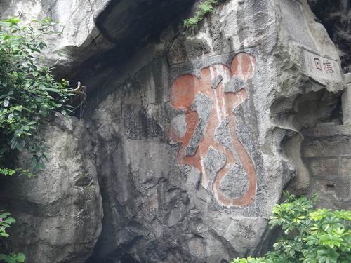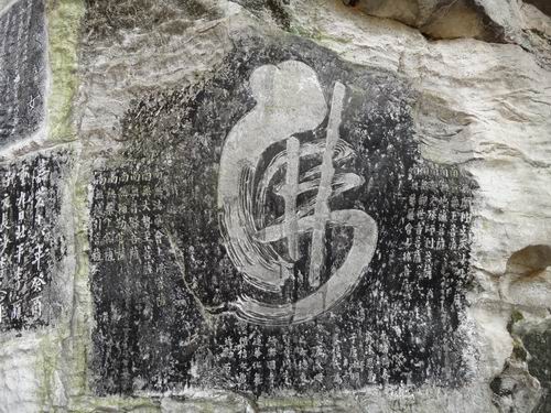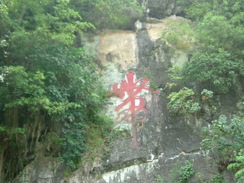 桂林の隠山の朝陽洞の入り口に書いた大文字の「龍」は幅1、5mで、高さ2mもあります。