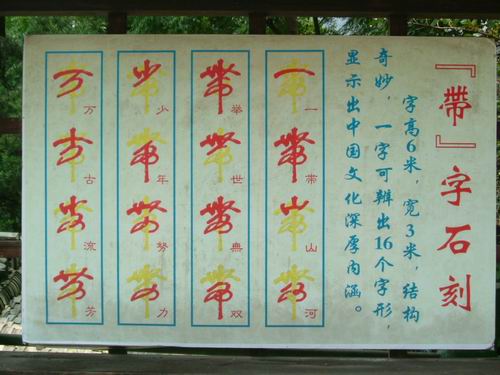 翌年の1834年、王元仁は陽朔の知県になり、景色の美しい碧蓮峰に高さ6メートル、幅3メートルの大文字の「帯」を挑戦しました。この大文字は隠れ文字であり、含蓄がある作品と思われ、見た人により想像が異なります。「一帯山河、少年努力」などの複雑な意味の漢詩が隠れるほど想像が尽きません。この文字は陽朔観光の名物となっています。