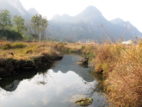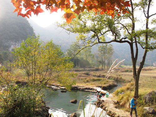 冬至が過ぎた後、厳しい冬に入りましたが、桂林では小春日和の日が続き、また紅葉を鑑賞するいい季節になってきました。12月29日(日曜日)、友達を誘って、桂林市郊外の霊川県霊田郷へハイキングに見に行きました。