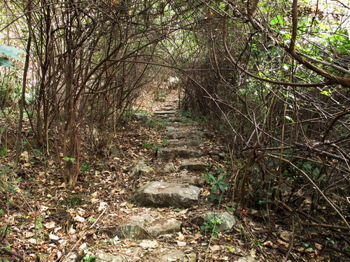 烏茅嶺は茅が生茂っているのでその名があったわけです。かつて賑やかだった古道は歩く人が少なくなったので、荊が生い茂るようになって、歩きにくくなりました。約一時間半歩いて、石の門が見えてきました。そこを潜って頭を持ち上げると、木の茂みに立派な石造りの建物が目の前に現れてきました...... (続く)
