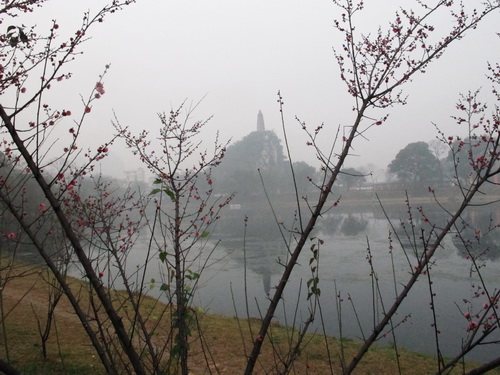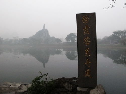 昨日、友達の韓さんと穿山公園へ梅の花見に行くと約束したので、今朝の7時に彼の家の近くの信号機の所に会合してから一緒に穿山公園の方へ向かいました。まだ薄暗くて、町が静かで、途中にはあまりに出会いませんでした。昨夜ちょっと雨が降りました。雨上がりの清らかな空気を吸いながら散歩して、とてもいい気持ちでした。10分ぐらい歩いて、穿山公園に着きました。周りは少し明るくなり始まりました。朝の小東江は目覚めたばかりのようで、静かに公園を流れ通っていました。水面に一筋の湯気が立っていて、塔山が鏡のような水面に映って、水墨画のように見えました。山頂にある寿仏塔は明時代に作られた八角の煉瓦の塔で、数百年以来いつまでもこのように小東江の畔に佇んきました。この景色は「塔山清影」と言い、桂林の古い八景の一つです。中国の代明の有名な旅行家徐霞客が桂林に訪れた時に小舟に乗ってここを見物した後、「穿山遊記」を書いたことがあります。