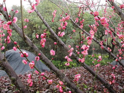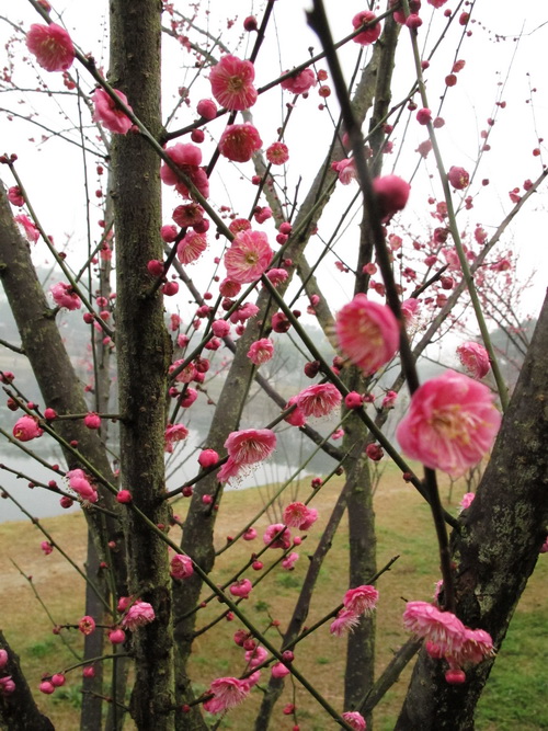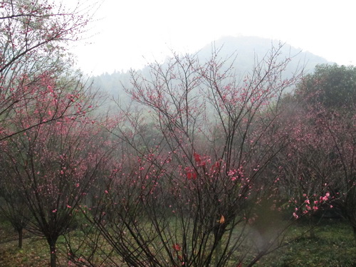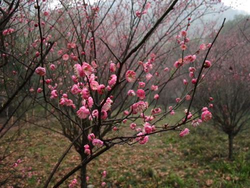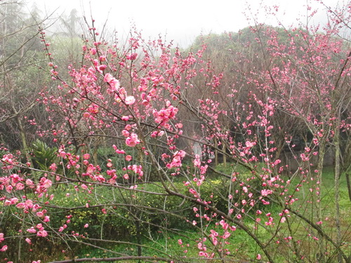 やっと梅の林が見えてきました。遠くから見て、赤、白、ピンクの梅の花がミルクのような朝靄の中で咲き誇っていました。桂林では今ちょうど梅を賞するいい季節を迎えきました。足を早く運んで近寄ると、梅の特別の甘い香りがほのかに漂ってきて、思わず深呼吸をしました。たぶん梅がこんなに早く咲いたのを思わなかったのでしょうか、私たち2人のほかに誰も花見をする人がいませんでした。おかげで、二人はゆっくりして、思う存分にこの辺りの梅花の景色を楽しむことができました。