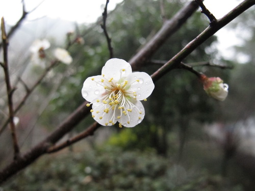 昔から中国の文人たちは寒い風雪を凌ぐ氷雪の梅を気高いシンボルに喩えて賛美してきました。梅がどんなに厳しい所でも生長できて、謙遜、堅忍不抜、根気強い中華民族の品性によく合うので、中華民国の国花に定められました。こう見たら、寒がり屋の私はどうしても高品な人間にはなれないなと思いますね。写真を思う存分に撮った後、そろそろ帰る時間になりました。ふと、目の前に咲き匂ったこれらの可憐な花が咲いたり、散ったして、到底、地面に舞い落ちて、泥に化する輪廻に逃れないと思うと思わず胸が痛くて、寂しくなりました。それから宋代の詩人陸遊(私と同じ名前の人)の「卜算子‧咏梅」の「無意苦爭春、一任群芳妒。零落成泥碾作塵、只有香如故。」(ひたすら春を争う意無く、一切群芳の妬むに任まかす。たとえ零落して泥と成ったり碾(ひ)かれて塵となったりしても、只だ香は故(もと)の如し。)という詩を詠むと人間だって同じことではないでしょうかと釈然しました。