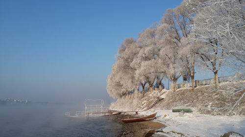 筆者にとって樹氷はかねてから何とかして見に行きたいものでした。そのために朝早く起きて、ホテルのロビーで地元の人に尋ねました。ところが地元の人に「樹氷は今日、駄目でしょう。気温がよほど低くないと見えないよ、風もないとみえないし」と言われました。筆者が少しこの話に落胆しましたが、一か八か行ってみようと決心しました。ここまで来た以上、行ってみないと一生の悔いになるかもしれないとも考えました。そこで朝7時半ごろ朝食を早く済ませ、タクシーを拾うことに決めました。市内のホテルから約15キロほど離れた松花江の豊満水力発電所の方向に向かいました。タクシーがおよそ20分ほど走ると、遠くに川面からいよいよ霧が立ち込めているのが見えました。「しめたぞ!今日、樹氷が見える」とタクシーの運転手は筆者を安堵させたような口ぶりで言ってくれました。確かに薄くて寒い朝霧の中に松花江の川面が現れ、あの銀色に輝き、ふわふわした毛皮のような樹氷がいっぱい見えたのではないですか。あの岸の樹木のすべてを美しく白く化粧した世界が一瞬に童話の世界のようにも見えました。