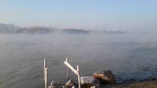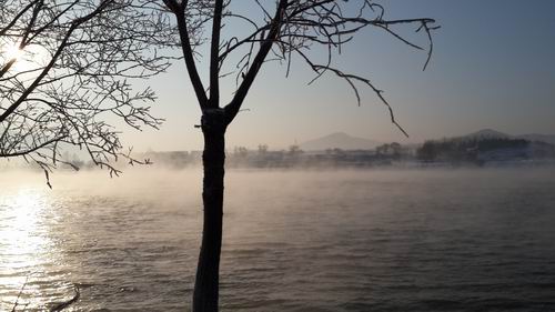 氷点下30度でも凍らない松花江の川面から水蒸気がたちこもめています