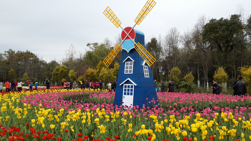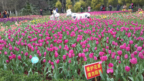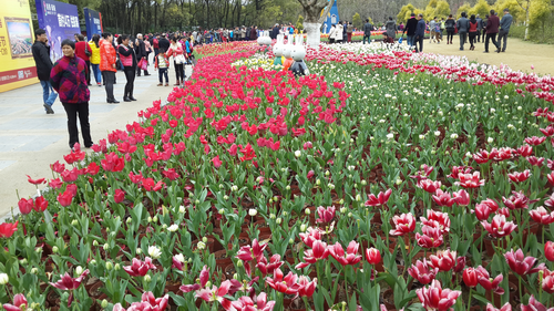 中国では旧暦のお正月の二日に当たる21日の夜に、中央テレビのニュースに桂林の番組が大々的に登場しました。それは訾州公園で栽培されたチューリップの展示会でした。桂林のお正月祝いの定番として必ず開催するこの公園の展示会ですが、2015年にマッチするように新たに市民の手による2015本のチューリップが加わりました。きれいな花のスクリーンに伴い、このようなセリフが流れました。「好い雨が時節を知り、春に当たり乃ち発生す」。この頃、ひとしきりの春雨が広西大地を潤い、漓江のかわの水も増水させました。「漓江煙雨」は最も美しい姿で羊の年である新春に初めての美景を描いてくれました。遅れた春節はちょうど各種の花が咲き誇り、人々が外出して遠足するシーズンにも重なっています。この中で桂林市民の手により丁寧に栽培された2015本のチューリップの花が春に捧げる最高のプレゼントとなりました」。報道によると桂林の訾州公園のチューリップの展示会が2011年の春節から開催されたもので、今年が五回目を迎えています。今年の展示会は例年と違い、市民を誘い「共に春を蒔こう」というイベントを企画しました。今年は例年よりも品種が多く、合わせて40の品種が揃い、約10万にも上る鉢植えのボリュームにもなりました。統計によると2月19日から21日までの三日間に延べ12.5万人の来場者がいたということです。中に桂林の市民もいれば遠くから観光に訪れた人もいました。今回、桂林のチューリップ展示会がまた中央テレビの報道に注目されたことにより、全国的な影響力や知名度がさらに上がるだろう。訾州公園は国内におけるチューリップの鑑賞の新たな聖地になるのではないかと期待されそうです。