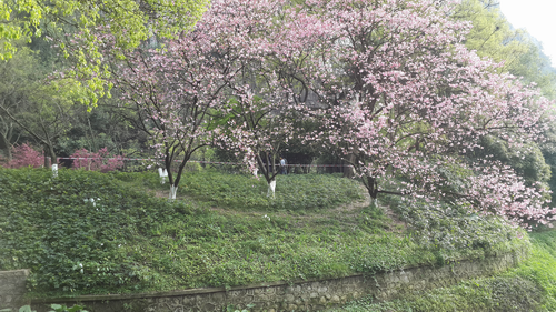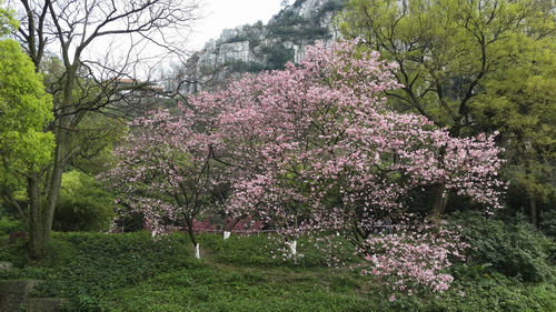 昨日、筆者が桂林の南渓山公園に行ってきました。それに先立って桂林の夕刊に出た南渓山の桜がすでに咲いている記事を読んでいたわけです。桂林は昨日の午後、南寄りの風が吹き、温度がいきなり26度にあがりました。それにしてもほぼ100パーセントの湿度に包まれた南渓山公園はやはり市民や観光客で賑わっていました。みんな開花している桜の花見のために来ているのではなかろうか。筆者は公園で人の流れについてこの一足早く咲いた桜の場所に行きました。案の定、三本の約3メートルほど高い大木の枝にピンク色の桜がぽかぽかとしたそよ風に揺れて満開することがわかりました。この三本の桜の木は当時中日友好のシンボルとして1981年に日本の友人から送られたものです。この桜の開花に惹かれて来た観光客などが興味津々に写真を撮っていました。この一足早く咲いた桜は桂林の桜の花見の先駆けと位置づけられ、本番の開花ではありません。例年ですとこの開花から十日ほど数えると、南渓山にある桜の「大軍団」が咲くだろうと見込まれます。その時、筆者は言うもでもなくこの「大軍団」についてのブロッグを書きたいと期待しているものですが、
