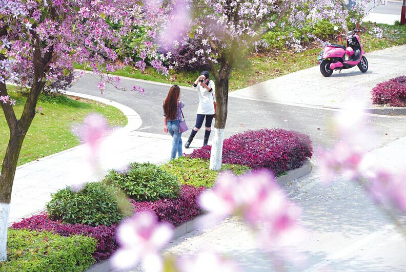 市民はバウヒニアが満開の柳州市静蘭路を通っている