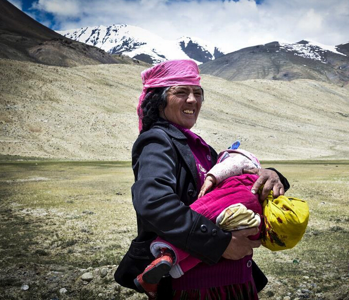 パミール高原で、孫を抱え親戚の家へ向かっている牧民を見かけました。