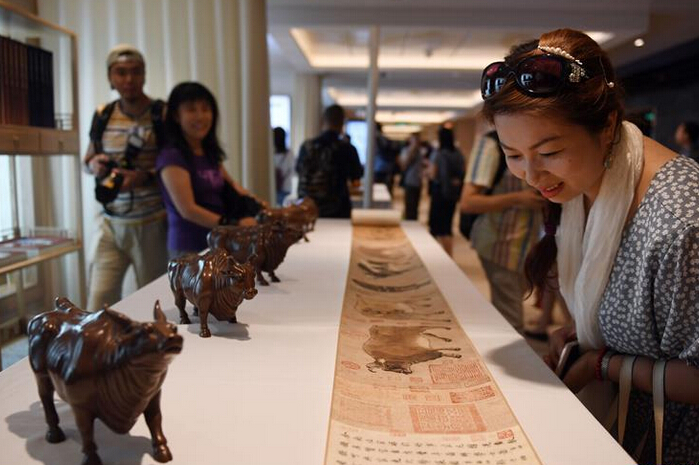 「海洋賛礼号」で故宮文化創作展示品を興味津々に見物している女性
