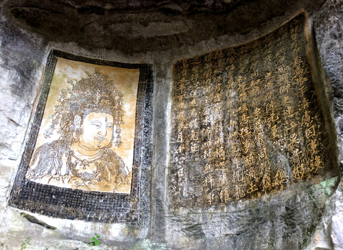 普段、観音さんは優しい女性の顔ですが、龍隠岩に刻まれた観音さんは男性の顔の観音像があります。この観音像は清代の康熙四年(1665年)に刻まれたのです。額に慧眼が一つ有り、螺髻に小さい化佛が三つあります。また、唇に髭があり、珍しい男顔の観音像です。