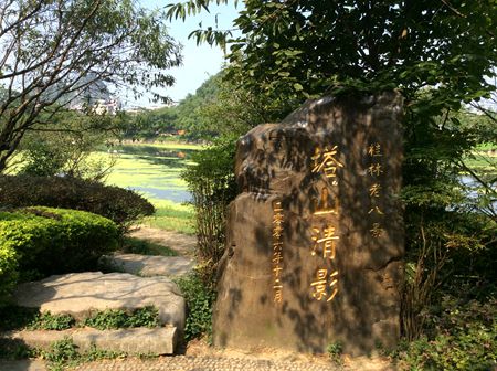 公園に入って、まもなく素晴らしい水墨画―「塔山倒影」が目の前に開いてきました。塔山は小東江の畔に聳え立ち、高さが44メートルあり、階段が400段ぐらいです。狭い頂上にはぎりぎりに「壽佛塔」が建てられています。塔は明の時代の物で、既に400年の歴史があります。塔は高さ13.3メートル、中身が詰まっている煉瓦造りの八角塔です。山の周りに楓の木があり、秋に紅葉すると格別美しい景色です。