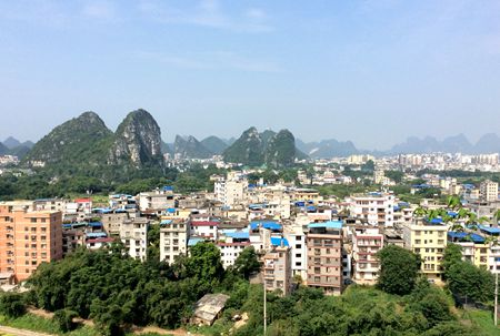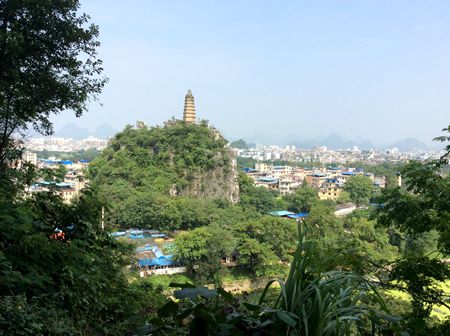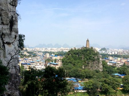 先週の日曜日、久し振りに穿山公園へ見物に行きました。穿山公園は桂林市の東南部にあり、市の中心部より約3.5キロくらい離れています。家(甲天下広場の近く)から穿山までゆっくり歩いて、約20分ぐらいかかりました。天気が暑かったですが、公園の中に木が多くて、あまり日に焼きませんでした。観光客が少なく、のんびりして見物ができて、よかったです。見所は主に塔山と月岩の二箇所の所だと思います。