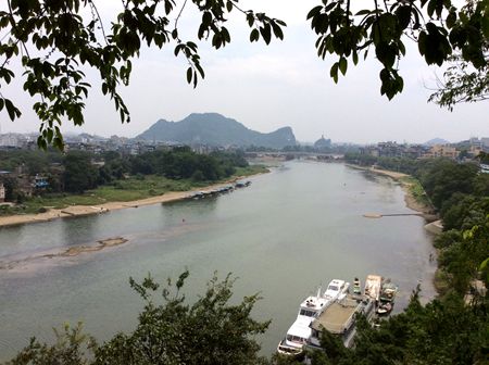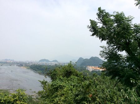 頂上から遠くは穿山、塔山と七星山が見え、近くは、市区と漓江の景色が見えて、素晴らしい景色でした。山の上に明時代に建てられた宝塔があります。それは普賢菩薩を祀るお塔で、普賢塔と言います。中国には普賢菩薩を祀るお塔が四川省の峨眉山と桂林の象鼻山の二箇所しかありません。