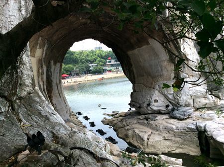 山の下にも貫通したまん丸い穴があり、それは水月洞です。水月洞の岩壁に唐代からの石刻がたくさん残されていますが、年月が経ったので、字がはっきり見えませんでした。宋代の有名な詩人陸游、範成大と張孝祥がそれぞれ水月洞に石刻を残しました。