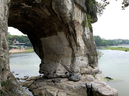 それから、最も素晴らしい石刻は「宋薊来た処士」と落款した「水底有明月、水上明月浮。水流月不去、月去水還流」(水底に名月有り、水上に名月浮かぶ。水流れて、月さらず、月去って、水まだ流るる。)という詩です。その詩は空、水面と洞窟に合わせて三つの満月が存在する象鼻山と漓江の十五夜の夜景をうまく描いたのです。