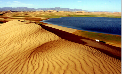 金子海について、2つの昔話があります。一つは、兵士とともにチンギス・ハーンがこちらを通った時に、金の杯を残し、金子海に変化したということです。もう一つは山の上から金羊が水を飲みに山を降りてきたら、水の甘さと美味しさに感動され、二度と山に戻りたくはなくなり、湖の中へ入っていきました。そのため、金子海と呼ばれているそうです。海の西側、北西側と東側は砂山に囲まれており、その沙の柔らかさに思わず素足で歩きたくなります。