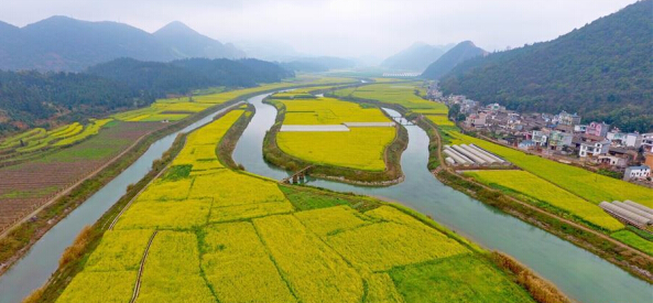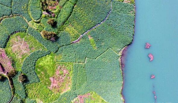 2月26日、湖南省衡陽県華山村にて、チャイナドレスを着ている人々は菜の花畑を通っていました。南の方は春の到来が早く、空中から見てみると、色彩豊かな大地は至る所に春の気配が漂っています。