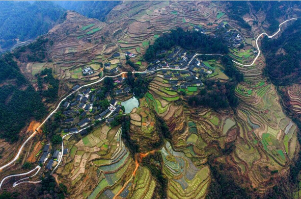 湖南省・湘西トウちゃ族ミャオ族自治州・龍山県・泽果村にて見られる、春の段々畑です。