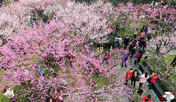江蘇省常州市紅梅公園にて、満開の梅を堪能している人々。