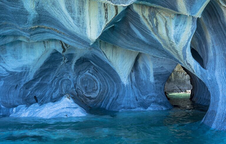 チリの大理石洞窟(Marble Cathedral)がカレーラ湖に位置し、洞窟に湖水が流れ、舟を漕いで遊覧すれば面白いです。