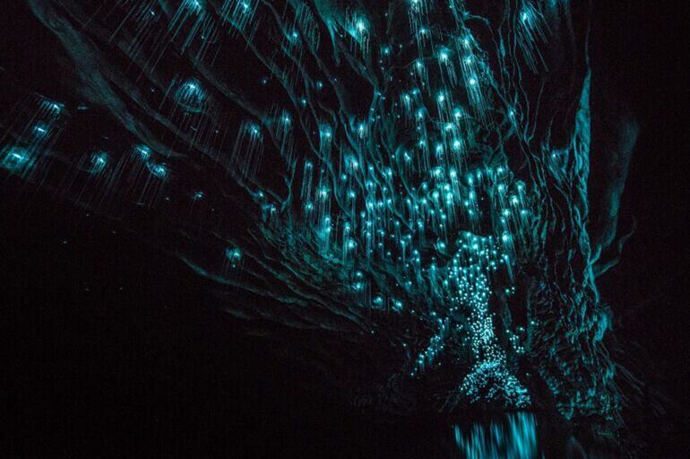 ニュージーランドのRuakuri洞窟、数千の蠕虫(ぜんちゅう)が燐光を輝き、岩壁に明るく照らしています。