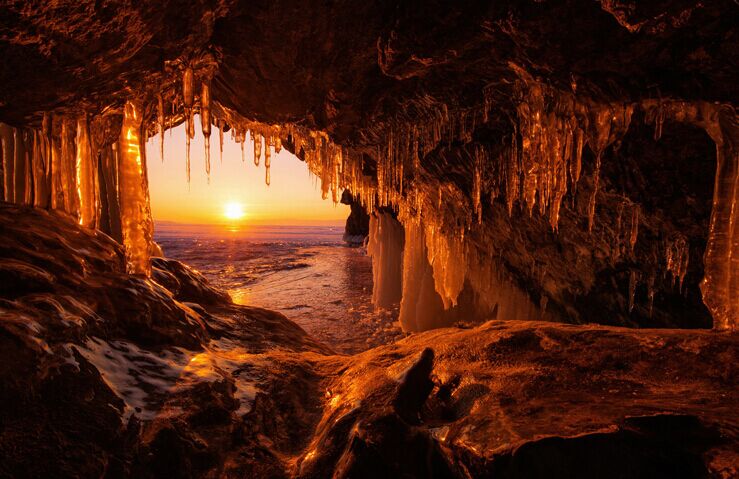 バイカル湖のシベリア氷洞、夕日の染まりで温暖な色調になっています。