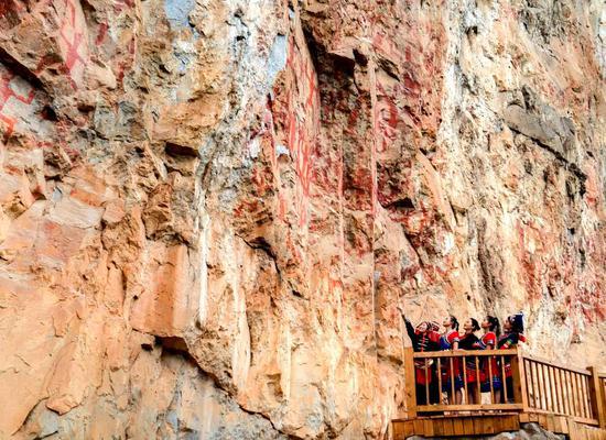 花山の切り立った崖全体には、様々な赤い人物と物の壁画が見られて、たとえ遠くから見ても、その壁面の赤い跡も見えます。これらの画像の大きさやポーズが違い、武道を学んだり、踊りを踊ったりする岩絵があります。