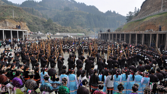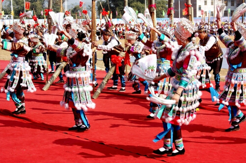 お祝いの時に村人が鼓楼という木造建築の前の広場に集まって、奇麗な服装を着ている女性は刺繍したハンカチと派手な傘を手にして、蘆笙のアクトに合わせて楽しく踊ります。
