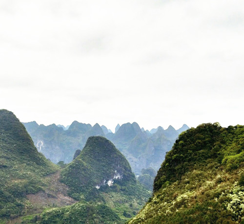繋がった山並みの峰とくねくねと流れている漓江の景色を見ているうちに中国で有名な大詩人韓愈の詩句を思い出しました。「川が緑の帯を成して山が碧玉の簪の如し」と。