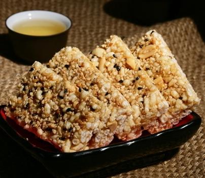 「米花糖」とは米に圧力をかけ膨らませ,四角に固め砂糖をまぶしたお菓子です。成都の「蒲江米花糖」は最も有名で、四川省の漢族の伝統的おやつとして、いい香りを持ち、甘くてサクサクしていてみんなに愛されているのです。胡麻やピーナッツなどを入れるのもあります。